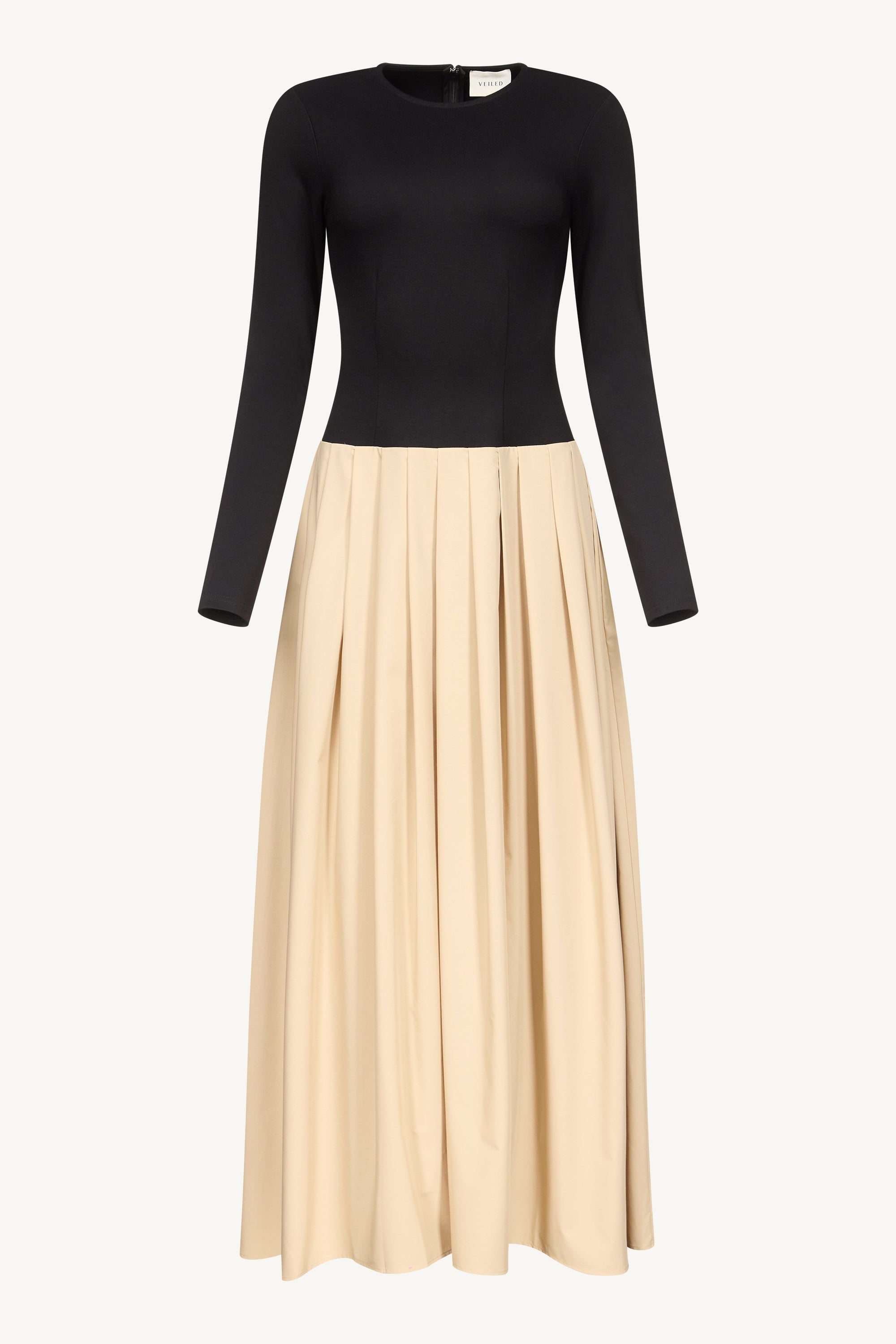 Camella Drop Waist Pleated Maxi Dress - Black/Beige Dresses Veiled