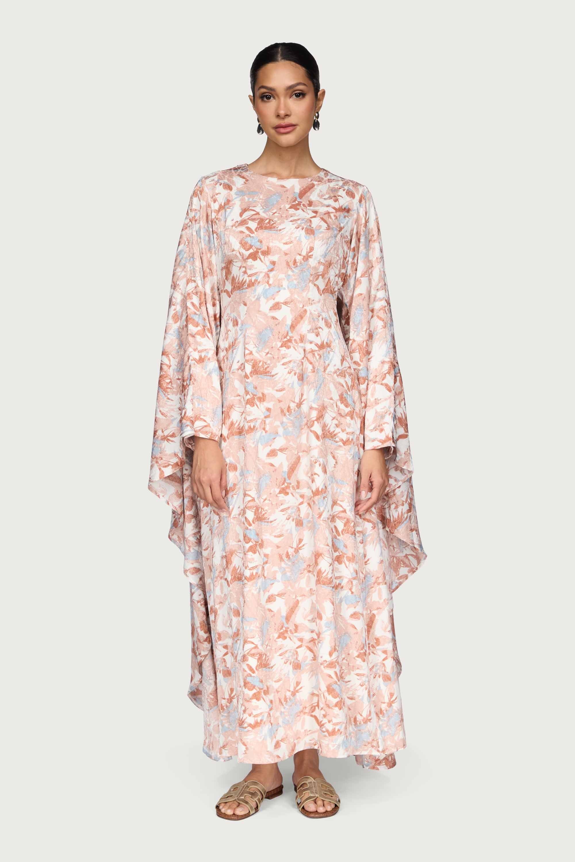 Elevate your wardrobe with this Printed Kaftan Maxi Dress in Pink. Featuring an adjustable tie waist for a personalized fit and dramatic flare sleeves that add a touch of elegance, this dress combines comfort with refined style. Perfect for making a graceful statement at any occasion.