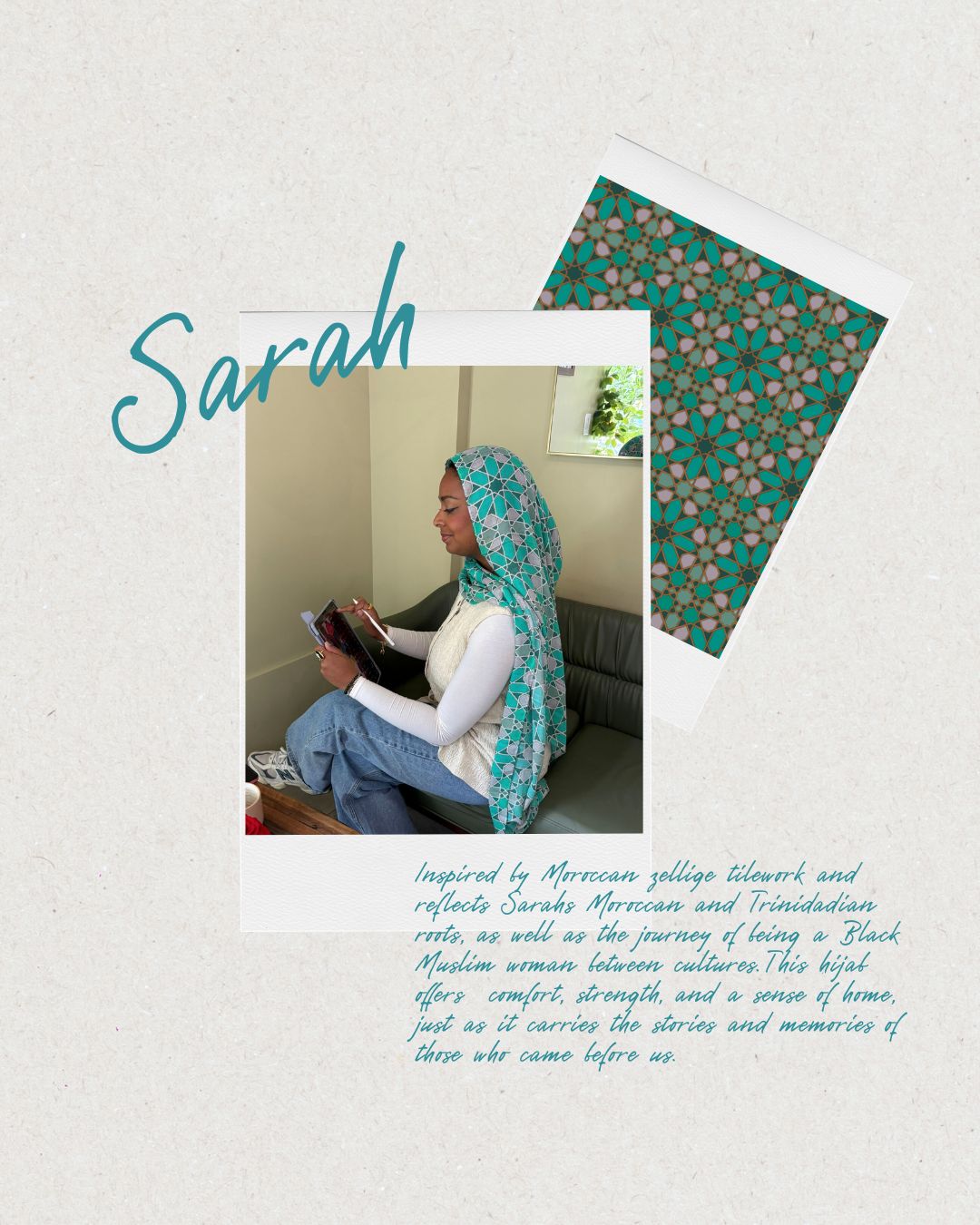 Discover our Emerald Mosaic hijab, designed by @sarahs.artbook. This scarf is inspired by Moroccan zellige tilework, which feels like a quiet memory passed down through generations. The patterns, the deep blues, and the earthy warmth speak to Sarah's Moroccan and Trinidadian roots through the layered journey of being a Black Muslim woman growing up between cultures.