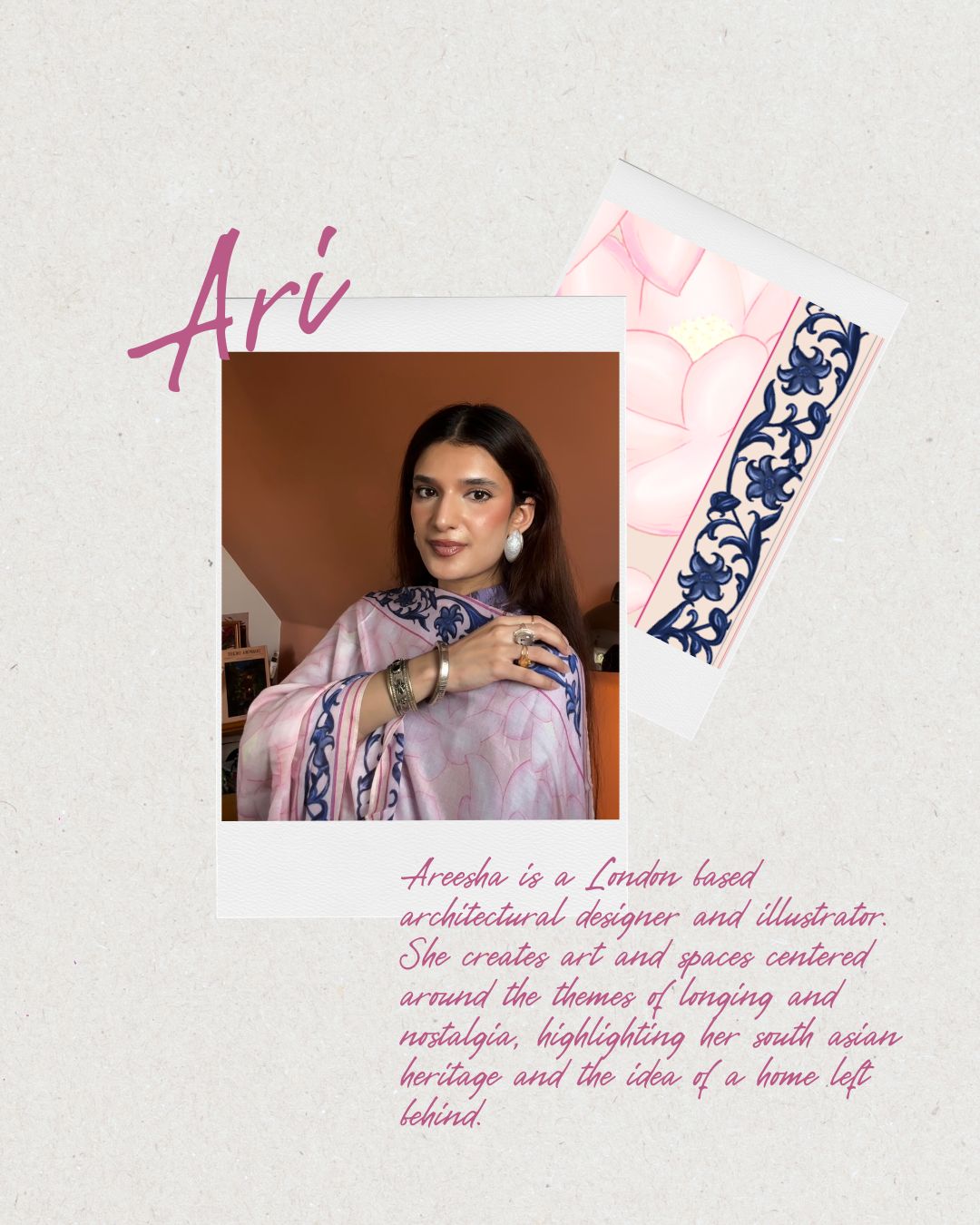 Areesha is a London based architectural designer and illustrator. She creates art and spaces centered around the themes of longing and nostalgia, highlighting her south asian heritage and the idea of a home left behind. ‘Gul-e-bahar//meaning ‘flowers of spring’ in Urdu, aims to encapsulate the blissful feeling of walking through a blossoming garden on a warm, breezy, spring day. Follow Areesha @architecturebyari for more!