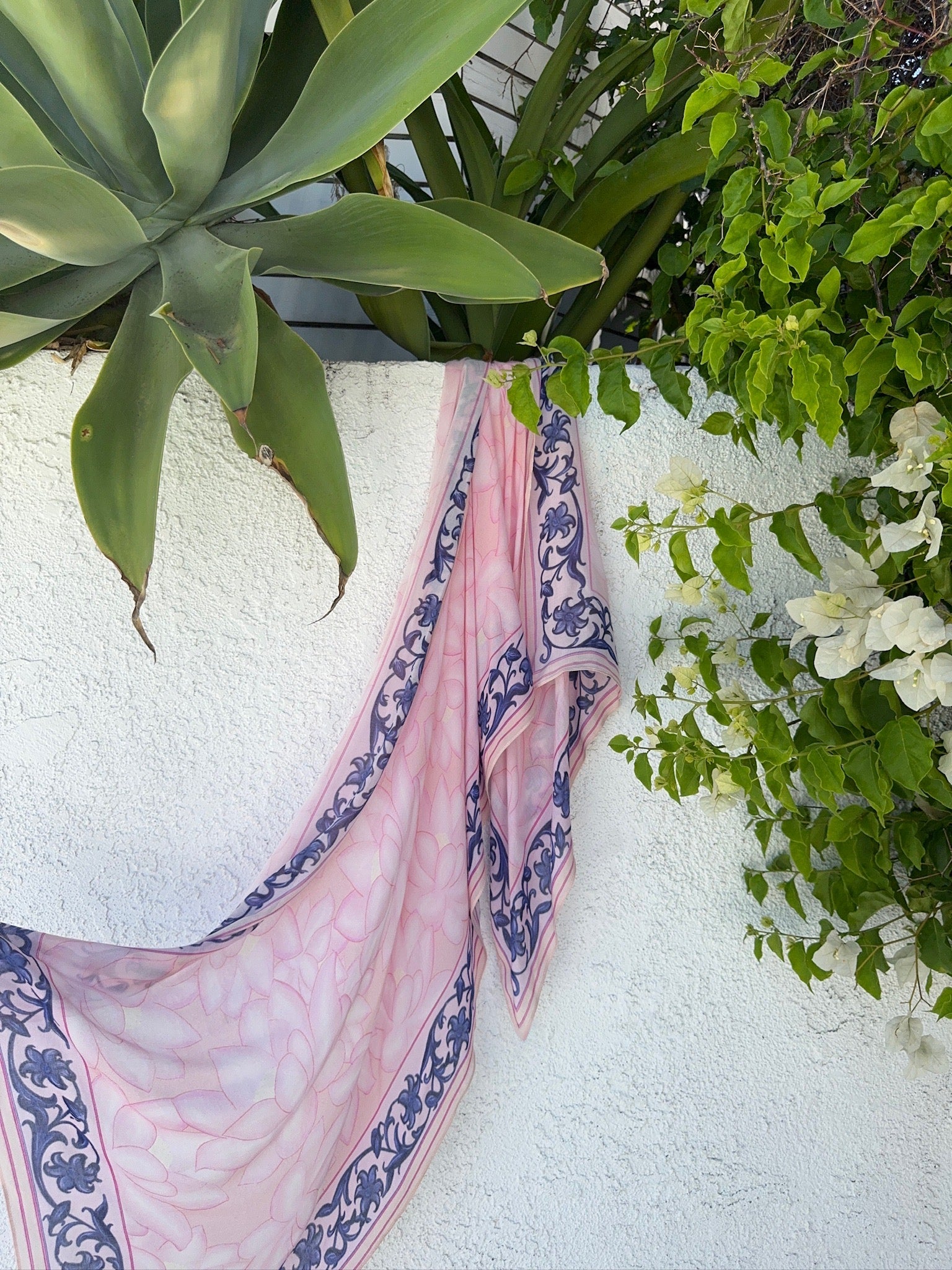 Discover Flowers of Spring, designed by @architecturebyari. ‘Gul-e-bahar//meaning ‘flowers of spring’ in Urdu, aims to encapsulate the blissful feeling of walking through a blossoming garden on a warm, breezy, spring day. The overall layout of the design, with its symmetrical floral vine border wrapping around the scarf is derived from mughal art, where such floral motifs are often seen around paintings. The focal point of the scarf is populated with delicate, pink, lotus flowers in a soft watercolour style, mimicking the mughal floral painting style. The lotus flower holds great significance in South Asian cultures, symbolising beauty and serenity. The philosophy of the lotus itself is perhaps what's most special about it and something we hope the wearer of this scarf is reminded of. One has to learn to bloom despite growing from the mud. Its roots grow in a muddy swamp, yet it flowers with the most gorgeous pink petals. Similar to how we have to pass through rough, dry winters to see a warm spring day with blooming flowers again one day. This is the essence of ‘Gul-e-bahar | Flowers of spring |گلِ بہار ’.