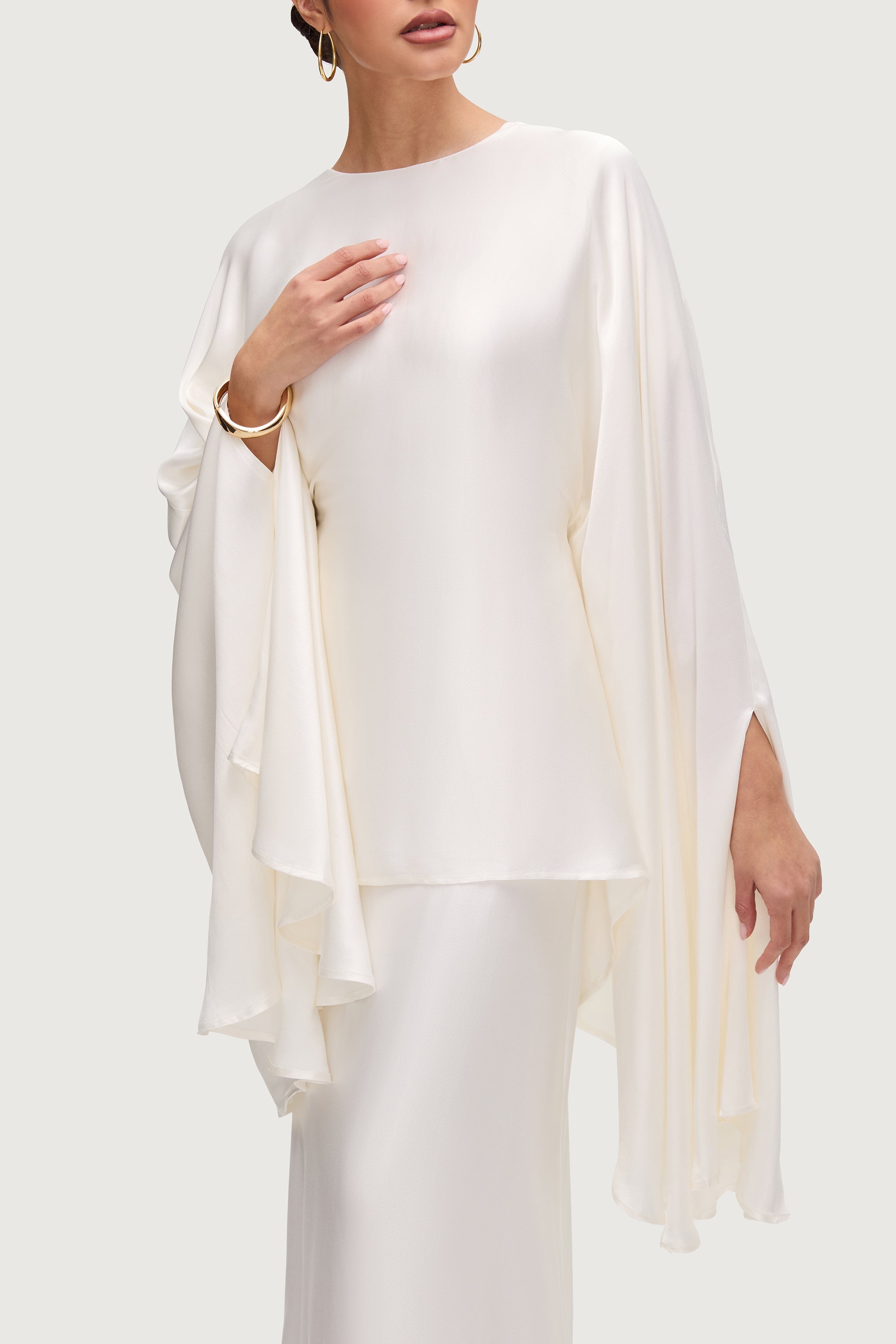 Indulge in luxury with our Razan Silk Inner Tie Top in White. Crafted from ethereal silk, this top features adjustable inner ties and dramatic flowy sleeves for an elegant and timeless look. Elevate your wardrobe with this exclusive piece.