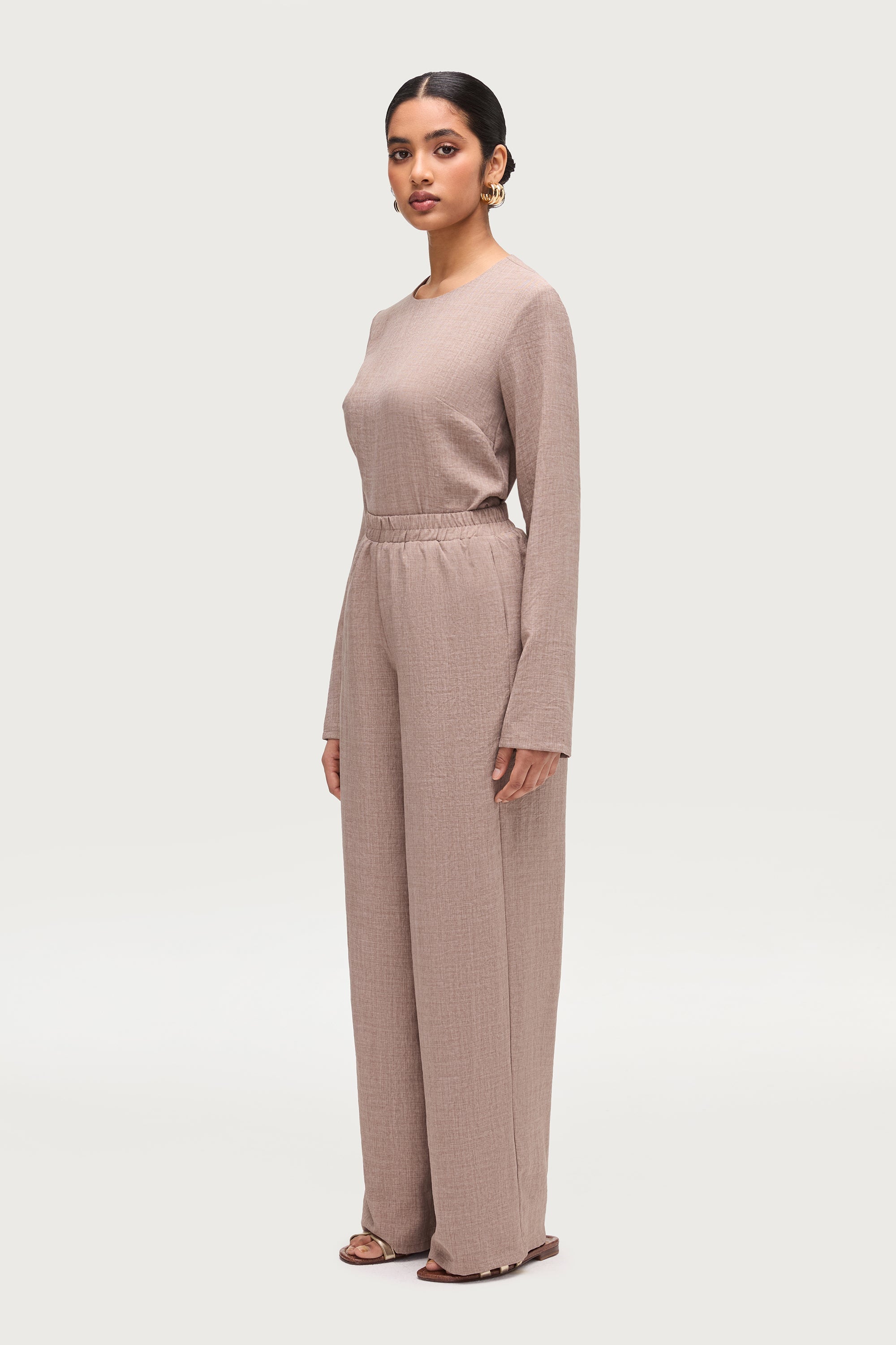 Elevate your wardrobe with our Sana Wide Leg Pants in Truffle. These classic wide leg pants are a must-have staple for everyday wear, complete with an elastic waistband for all day comfort. Embrace luxury and sophistication in every step with these elegant pants.