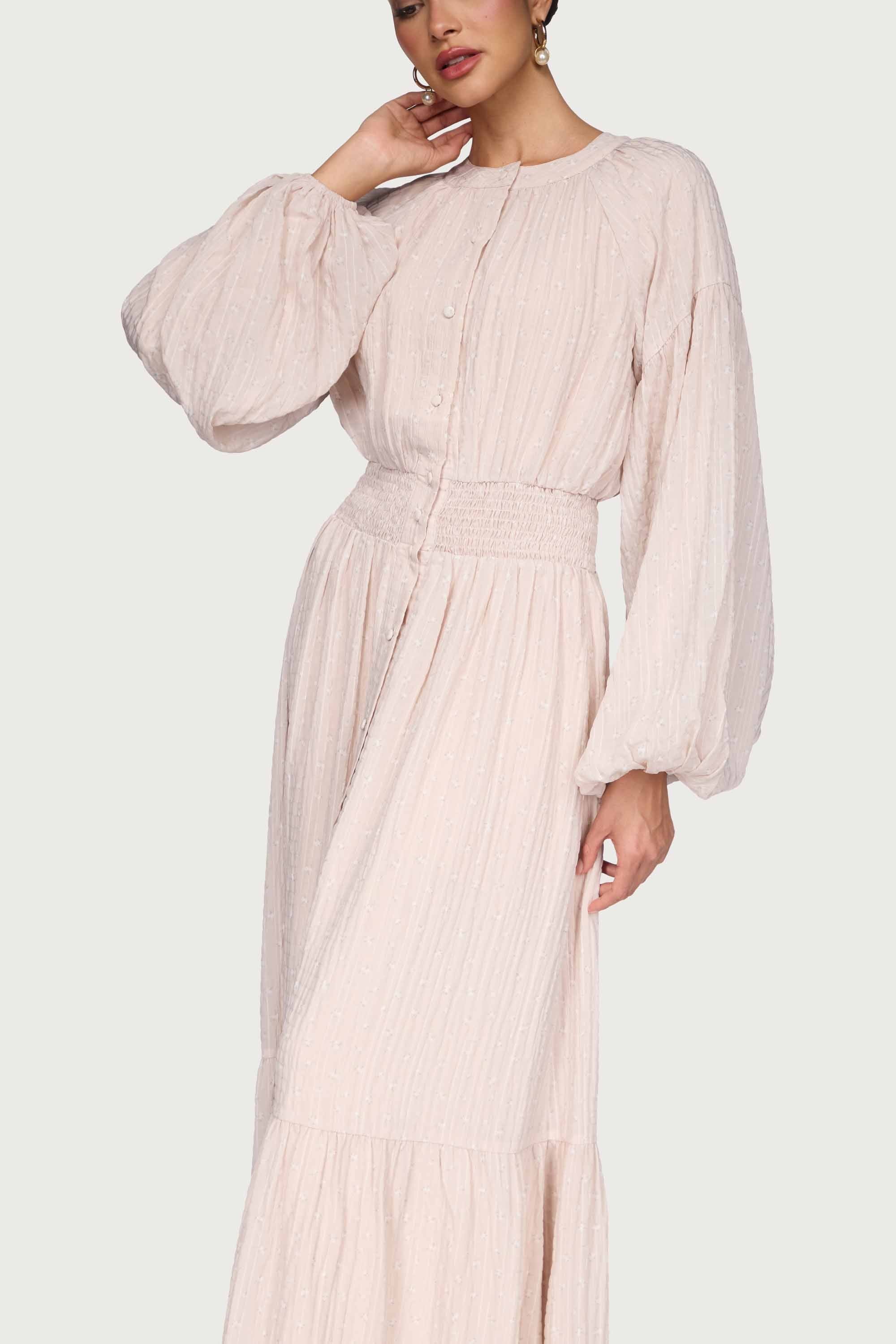 Refined and effortlessly graceful, our Smocked Waist Button Down Maxi Dress in Ditsy Pink Floral features a smocked waist that defines your silhouette beautifully. Crafted from textured fabric with a delicate floral print, it offers a romantic and feminine aesthetic. The balloon sleeves add subtle volume, while the breezy design ensures comfort and versatility, making it an ideal choice for both daytime elegance and evening sophistication.